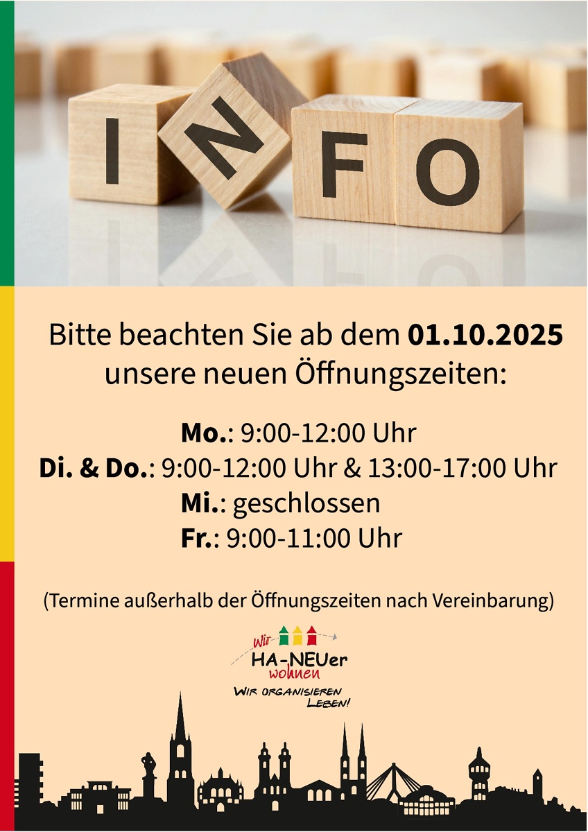 Liebe Mitglieder und Mieterinnen und Mieter, ab dem 01.10.2025 gelten neue Öffnungszeiten für unsere Genossenschaft: