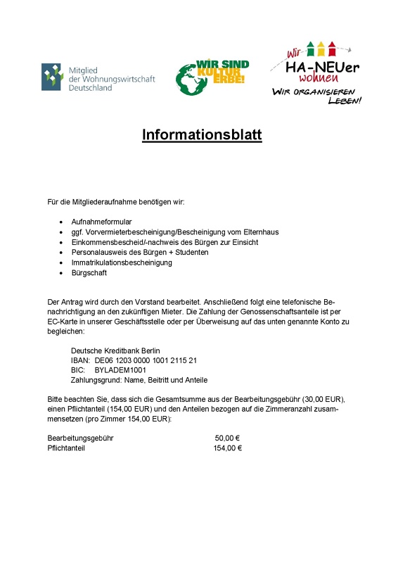 SatzungAufnahmeformularAntrag auf MitgliedschaftVorvermieterbescheinigung Informationsblatt Studenten Informationsblatt Mieter werben Mieter